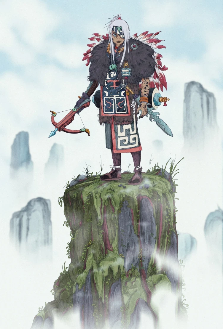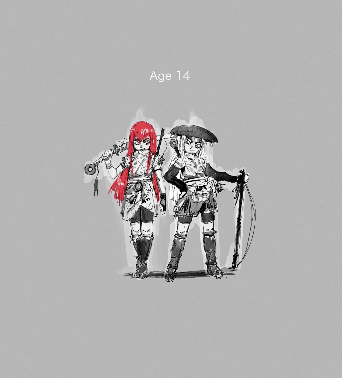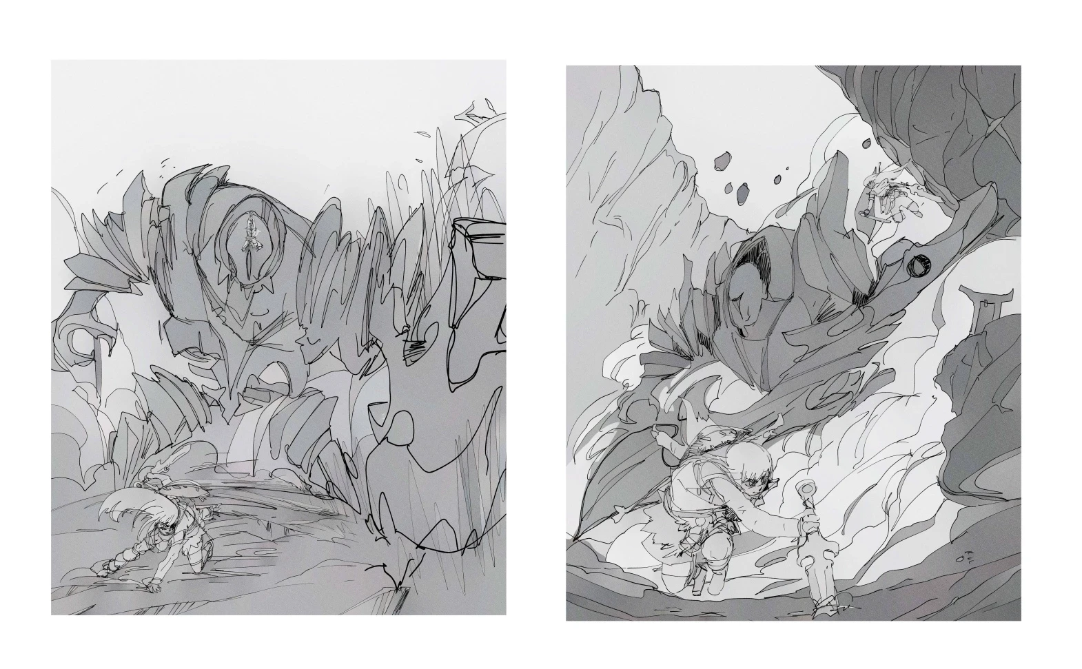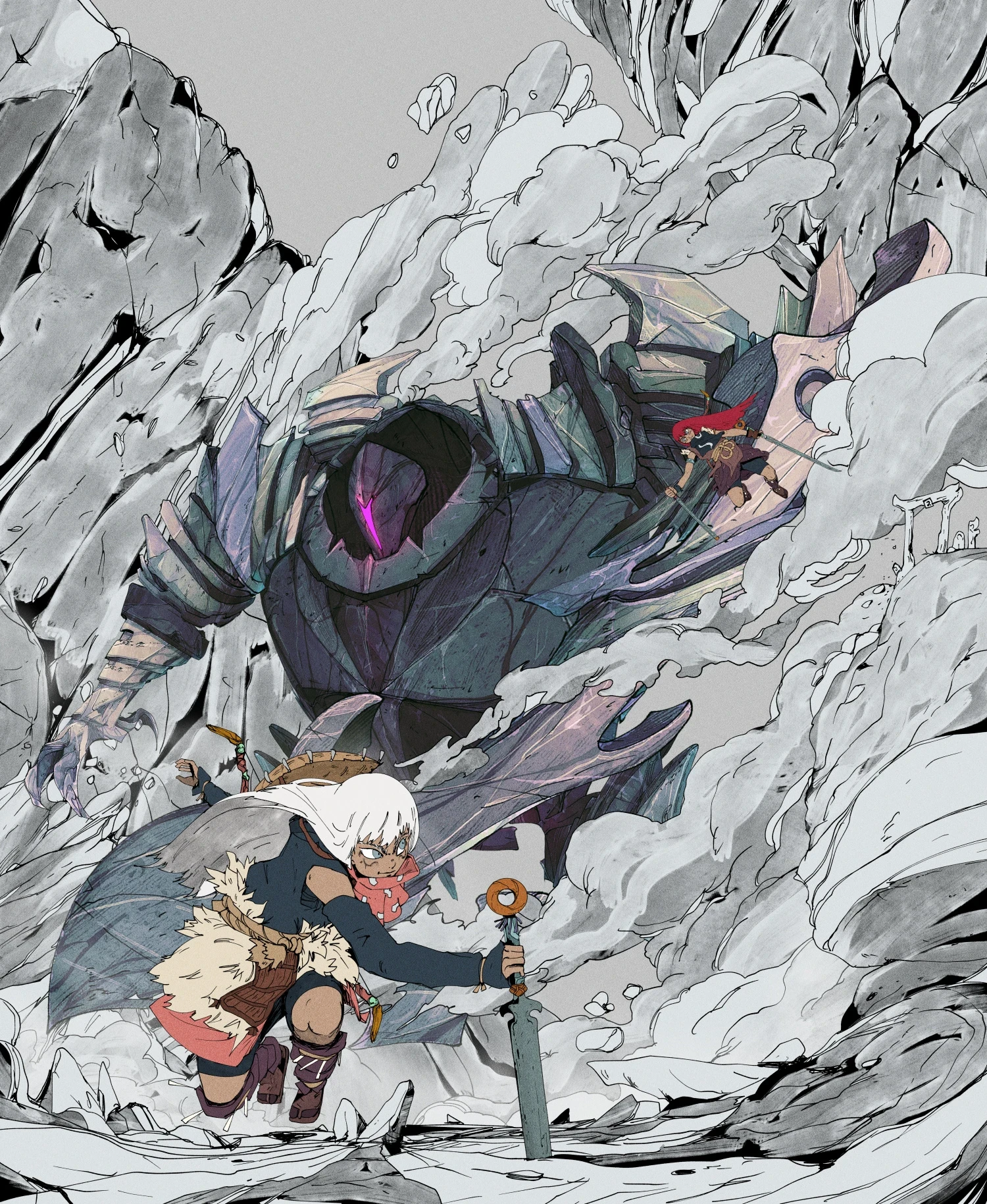 Visual Development/Board Game Illustration for Renegade Studios. Wraith & The Giants - New Dawn Expansion. Synopsis: Every 23 years since time unknown, Giants have risen from the lands beyond marching towards the village to feed. Your grandmother fought and defeated these monsters while she was alive; the duty had fallen to her upon the death of her grandmother, and so forth back as far as legend records. Your grandmother is gone, so you now must take up her sword and bow as a living shadow. Can you continue the story and protect the village from a catastrophic end? Wraith & The Giants is a solitaire game of epic battles with elemental giants! Progress through four unique boss fights at three different Wraith ages for huge replayability. Chain your card combos to scar and defeat the Giants. Expansion involves the new Twin Wraiths and the Metal Giant.
